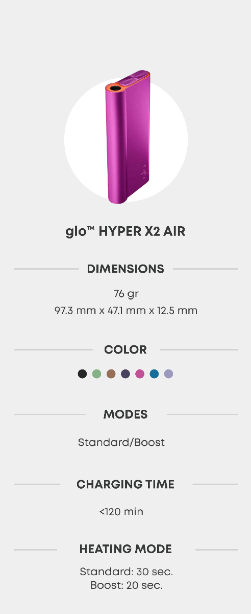 2 Compared to glo HYPER X2 Standard mode. This product is not without risks and contains nicotine, an addictive substance.